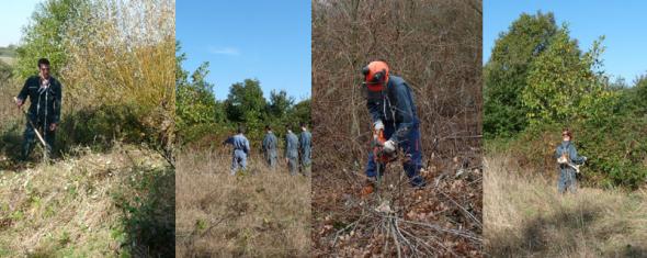 Pour la première étape initiée en automne 2009, débroussaillage et pose d'une clôtureont été au programme. Une vingtaine de lycéens en formation "Entretien et aménagement des espaces naturels et ruraux" et équipés de croissants, débroussailleuses et tronçonneuses se sont affairés jusqu'à la fin de l'hiver à dégager les ronciers et couper une partie des arbres.