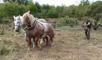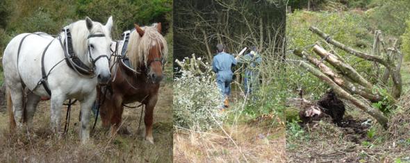 Les travaux réalisés l'hiver dernier ont consisté à éliminer une partie de la saulaie et poursuivre le débroussaillage général de la parcelle. Du fait de l'extrême sensibilité du milieu (végétation fragile, sol humide), nous avons sollicité la section traction animale du centre de formation de Montmorillon pour évacuer les rémanents de coupe et procéder à l'arrachage des souches.